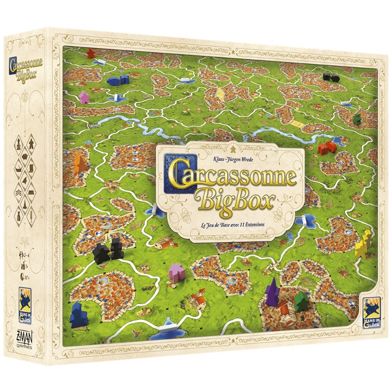 En plus du jeu de base, cette Big Box contient 11 extensions (2 complètes et 9 mini-extensions), compatibles entre elles, pour enrichir vos parties : Auberges & Cathédrales (extension 1), Marchands & Bâtisseurs (extension 2), La Rivière, L’Abbé, Les Ornithoptères, Les Missives, Les Bacs, Les Mines d’Or, Les Maîtres de la Magie, Les Voleurs, Les Agroglyphes.