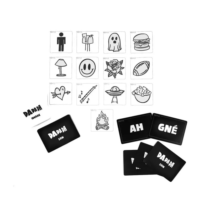 Dadada est un jeu coopératif sur la création d’un langage. Une fois la partie commencée, les joueurs ne peuvent pas utiliser de langues connues. Le défi pour l’équipe ? Communiquer en utilisant exclusivement les sons visibles sur la table.