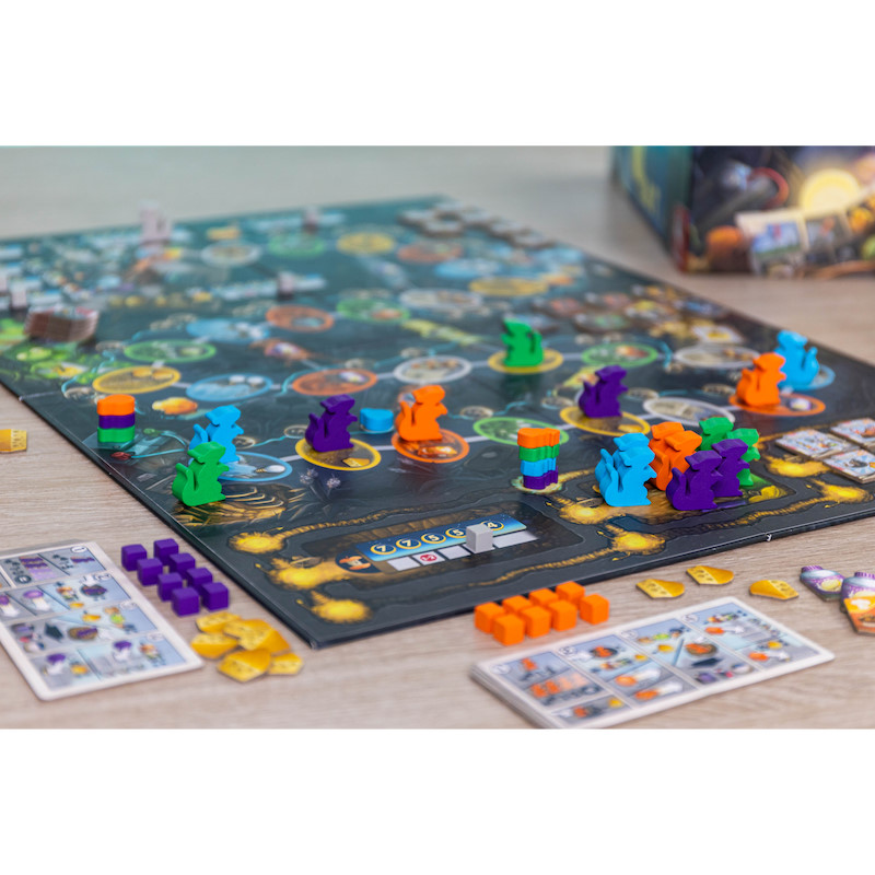 First Rat est un jeu pour jusqu’à cinq joueurs, également jouable en solo. De nombreuses stratégies, des compétences spéciales et une configuration variable créent un nouveau challenge à chaque partie. À chaque tour, les joueurs doivent décider s’ils souhaitent déplacer un de leurs rats jusqu’à cinq cases ou plusieurs jusqu’à trois cases – ce qui n’est possible que si les rats terminent leur déplacement sur des cases de la même couleur. Et s’il y a déjà des rats sur cette case, cela coûte également un fromage par rat ! En parcourant la casse, les joueurs collectent des ressources, achètent (ou volent) des objets utiles, construisent des pièces de fusée ou entraînent leurs Rattronautes, afin de récolter un maximum de points de victoire.
