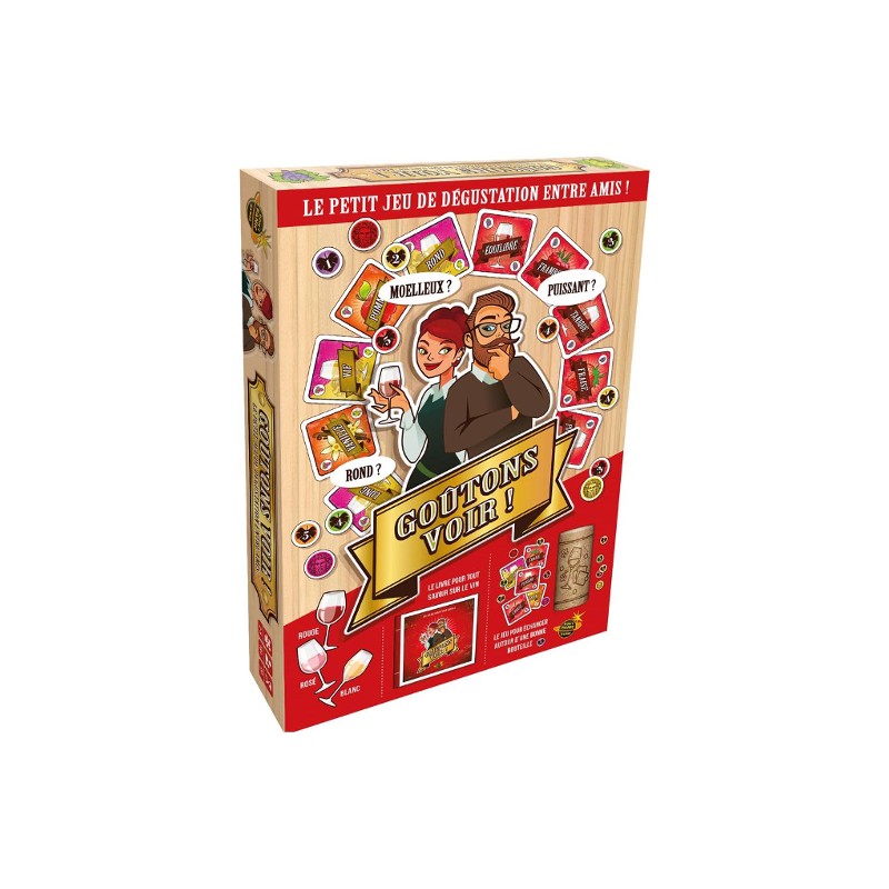Le jeu propose un contenu riche : cartes vin rouge et vin blanc/rosé, jetons, bouchon, mais aussi un livre complet (84 pages) sur le vin : cépages, arômes, labels, élevage, lexique… Une véritable initiation ludique et immersive. Goûtons Voir ! est un jeu convivial pour les amateurs de vin, qu’ils soient néophytes ou experts. Le vin n’est pas fourni avec le jeu et doit être consommé avec modération.