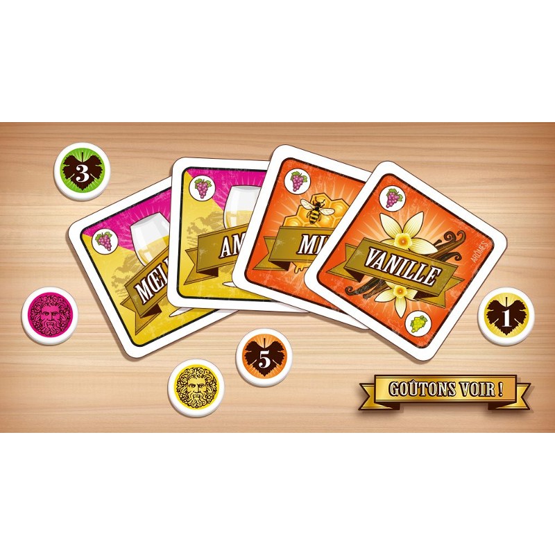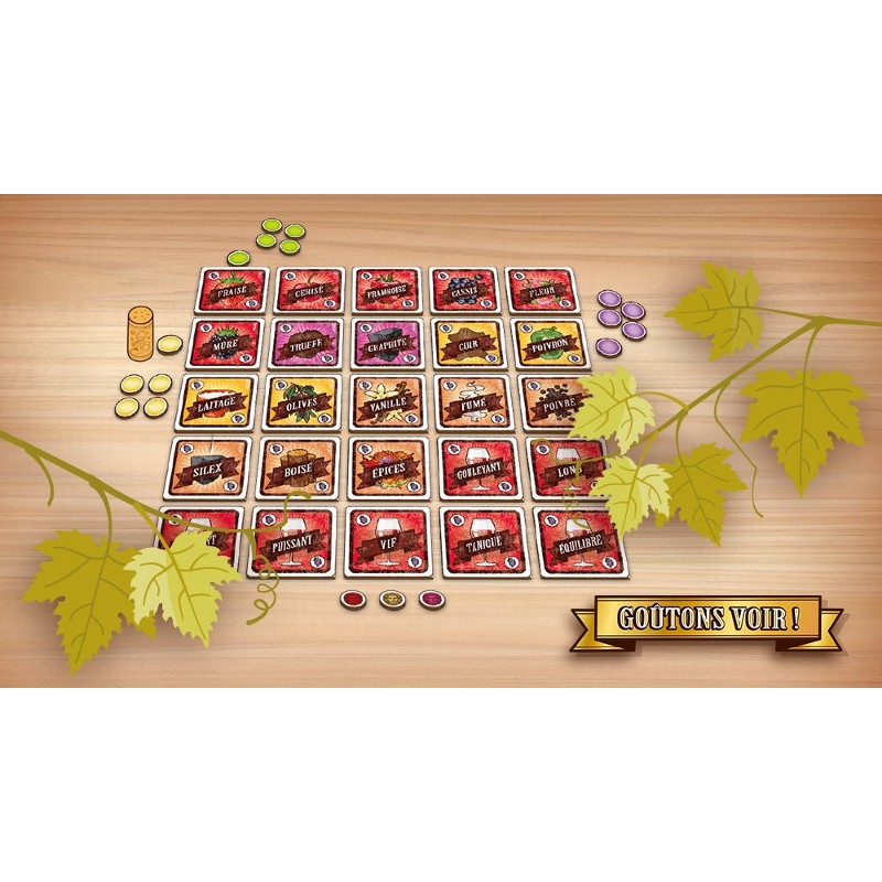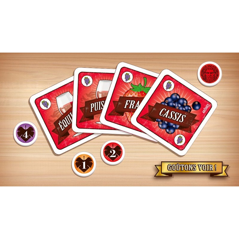 Le principe est simple : vous goûtez un vin à l’aveugle, puis chacun place ses jetons sur une grille d’arômes et de caractéristiques en fonction de ses propres ressentis. Une fois vos votes placés, vous devez éliminer les cartes jugées hors sujet… en espérant ne pas faire fausse route ! Le score final dépendra de votre capacité à vous synchroniser avec les autres joueurs.