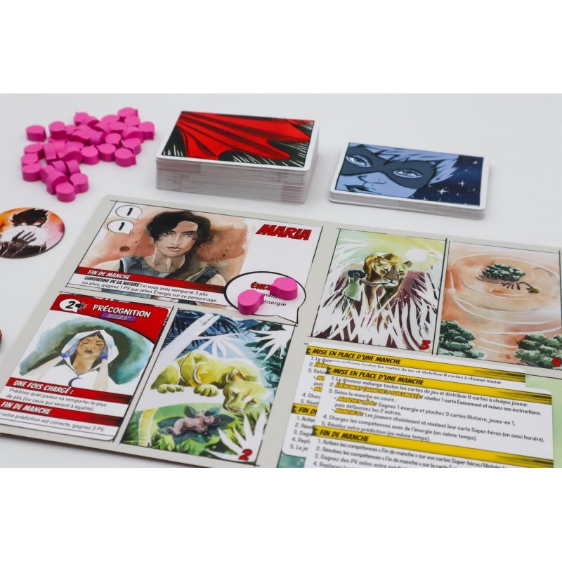 Origin Story est un jeu compétitif de construction de tableaux et de plis pour 1 à 5 joueurs, qui se joue en 5 manches. Chaque manche représente un chapitre de votre développement et vous permet d’ajouter une nouvelle carte à votre plateau. Chargez vos cartes et utilisez leurs capacités pour marquer plus de points que vos adversaires.