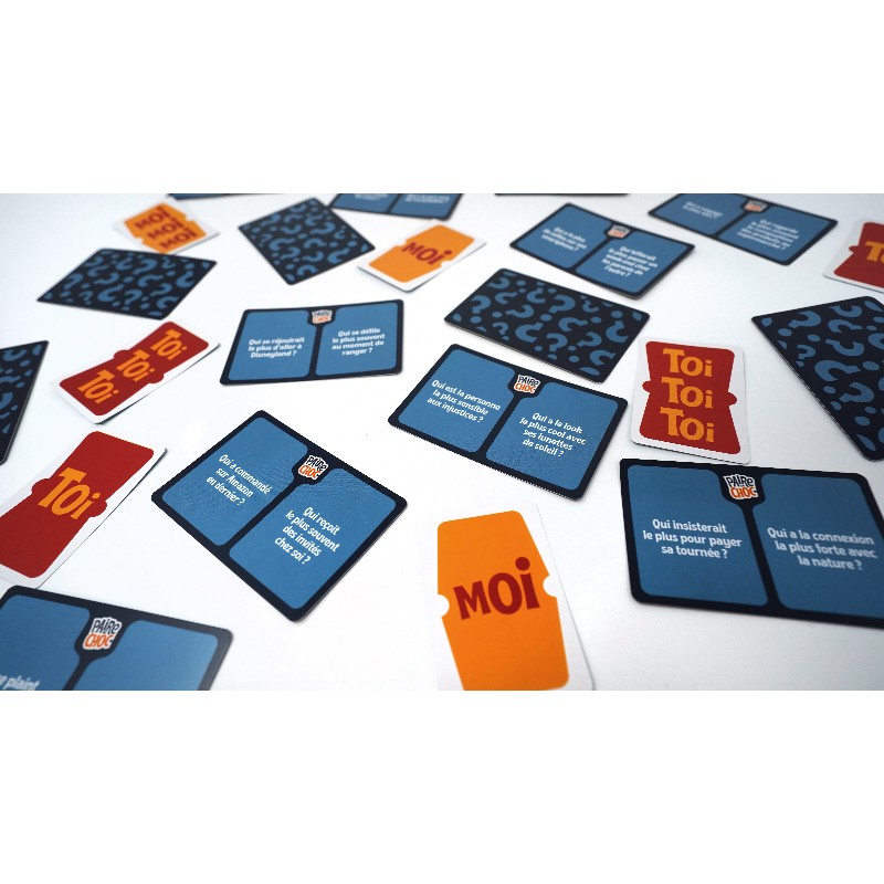 Paire de choc est le détonateur de soirée par excellence ! La boîte contient 300 questions décalées (Qui procrastine le plus ? Qui attire le plus les moustiques ? Qui a le prénom le plus sexy ? etc. ). Pour répondre, les joueurs vont simplement se comparer à leurs voisins de table et poser des cartes TOI ou MOI. Ambiance immédiate et surprises garanties lors des révélations !